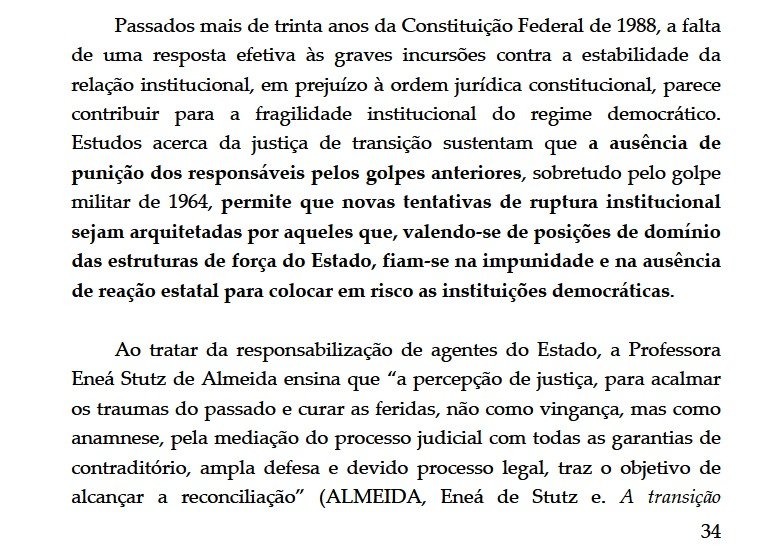 Foi publicado hoje o acórdão da AP 2668, que julgou o núcleo crucial da trama golpista no SupremoTribunal Federal. O inteiro teor do acórdão pode ser lido abaixo. Em um trecho do voto do Ministro Cristiano Zanin, há referência expressa ao livro da Professora Eneá (A transição brasileira, que pode ser acessado aqui no blog), bem como às lições da Professora: